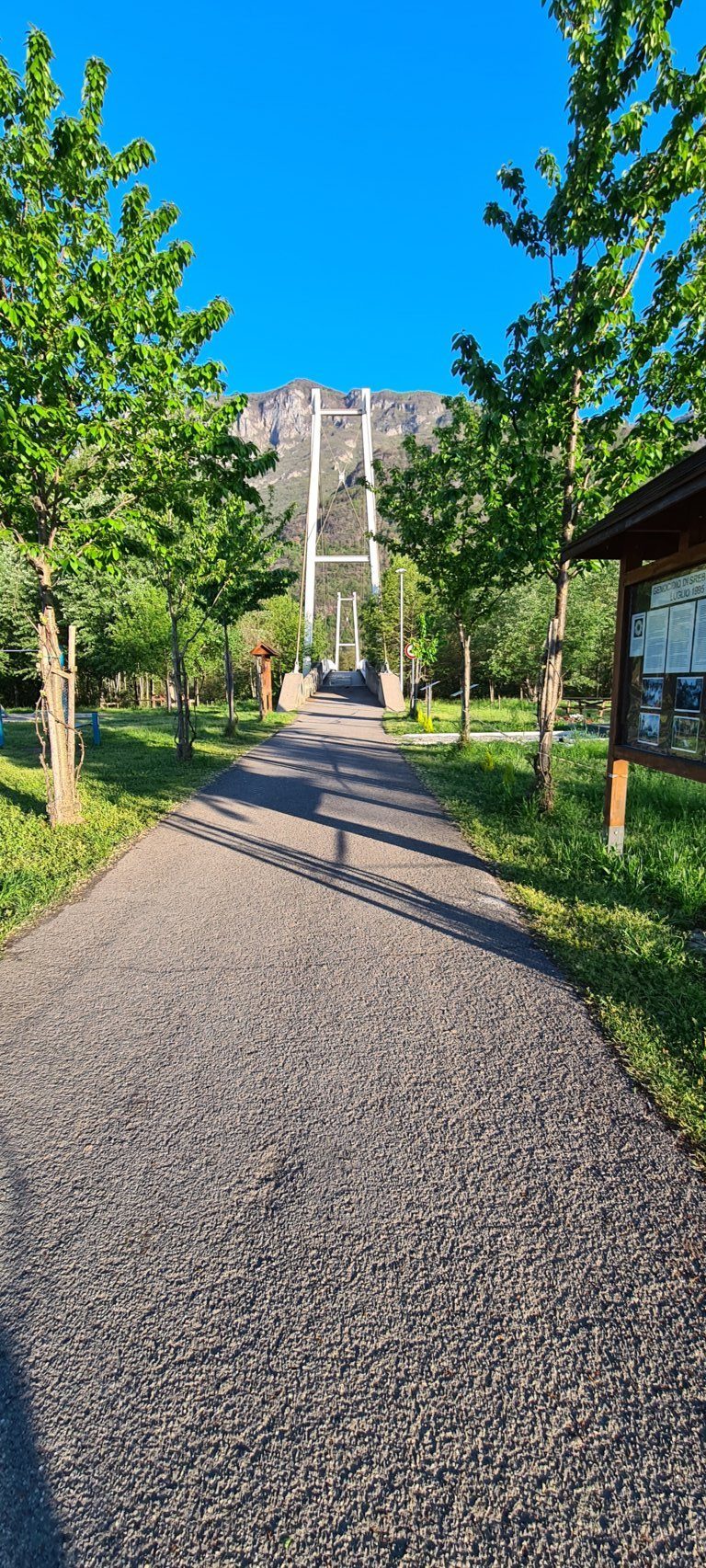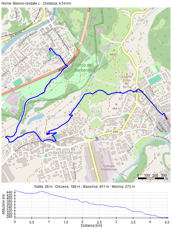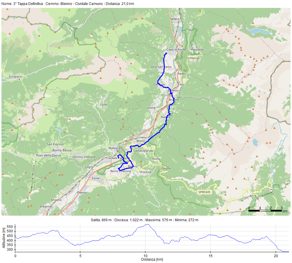 Dal centro di bienno prendere via luigi Ercoli - alla rotonda di fronte seguire la strada in salita che porta all'incrocio con tre strade prendere a sinistra seguendo il segnale verso la chiesa di san Lorenzo a Berzo - da san Lorenzo di scende verso l'oratorio di Berzo e attraverso la via Mazzoli Donato - all'incrocio con via SAN Tommaso davanti alla porta laterale della chiesa parrocchiale, prendere a destra su via san Tommaso e allo stop ancora a destra davanti alla casa del Beato proseguire su via redentore fino all'incrocio con la provinciale - prendere a destra verso il cimitero di Berzo su via Archimede - dopo il cimitero prima di imboccare la strada sterrata che porta alla Trinità di Esine si scende a destra su via Campi nuovi che in pochi metri porta a incrociare la strada per Cividate camuno - dopo in cimitero a sinistra si prende via Sovea e poi via Giuseppe Tovini che porta direttamente alla piazza della parrocchiale e della chiesetta dei beati Mosè e Giuseppe Tovini - da li si prosegue su via Tovini e via porta del castello e allo stop a destra seguire via Gere e poi sempre diritto via terme Romana fino all'incrocio su via IV novembre che a sinistra porta ad attraversare il ponte nuovo sul fiume Oglio - dopo il ponte girare a destra su via Cavour che porterà ad incrociare la via Lanico - dopo pochi metri sulla sinistra ci sarà il sottopasso del treno che porterà a prendere la strada che conduce al centro di Malegno!